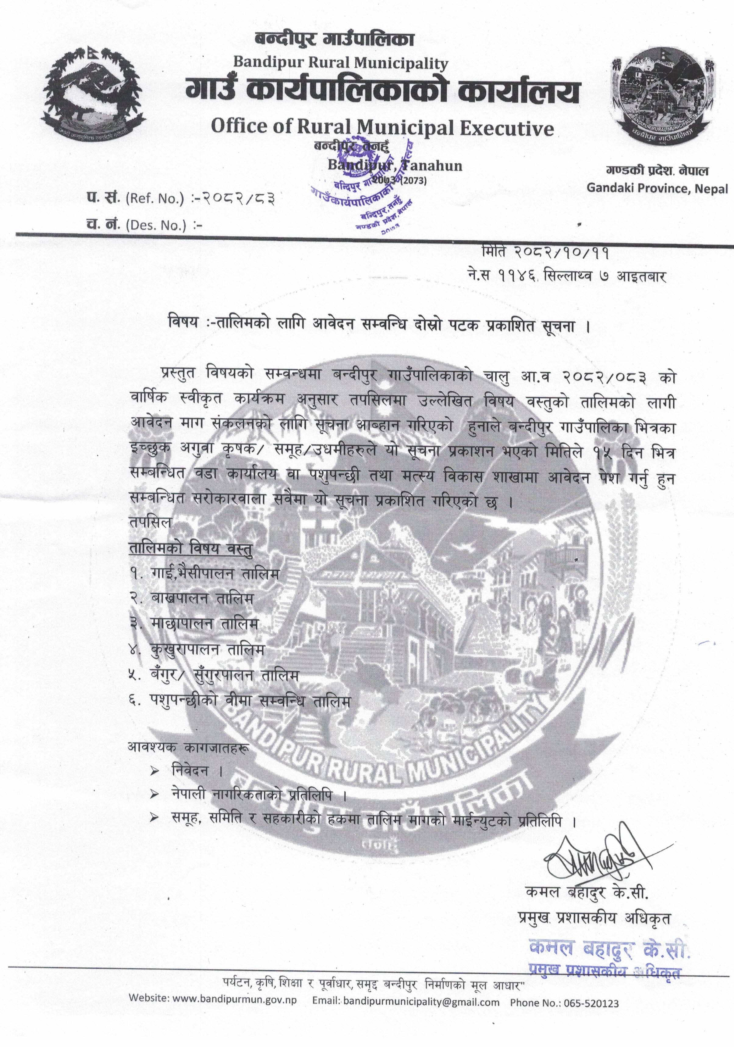 तालिमको लागि आवेदन पेश सम्बन्धी दोस्रो पटक प्रकाशित सूचना।