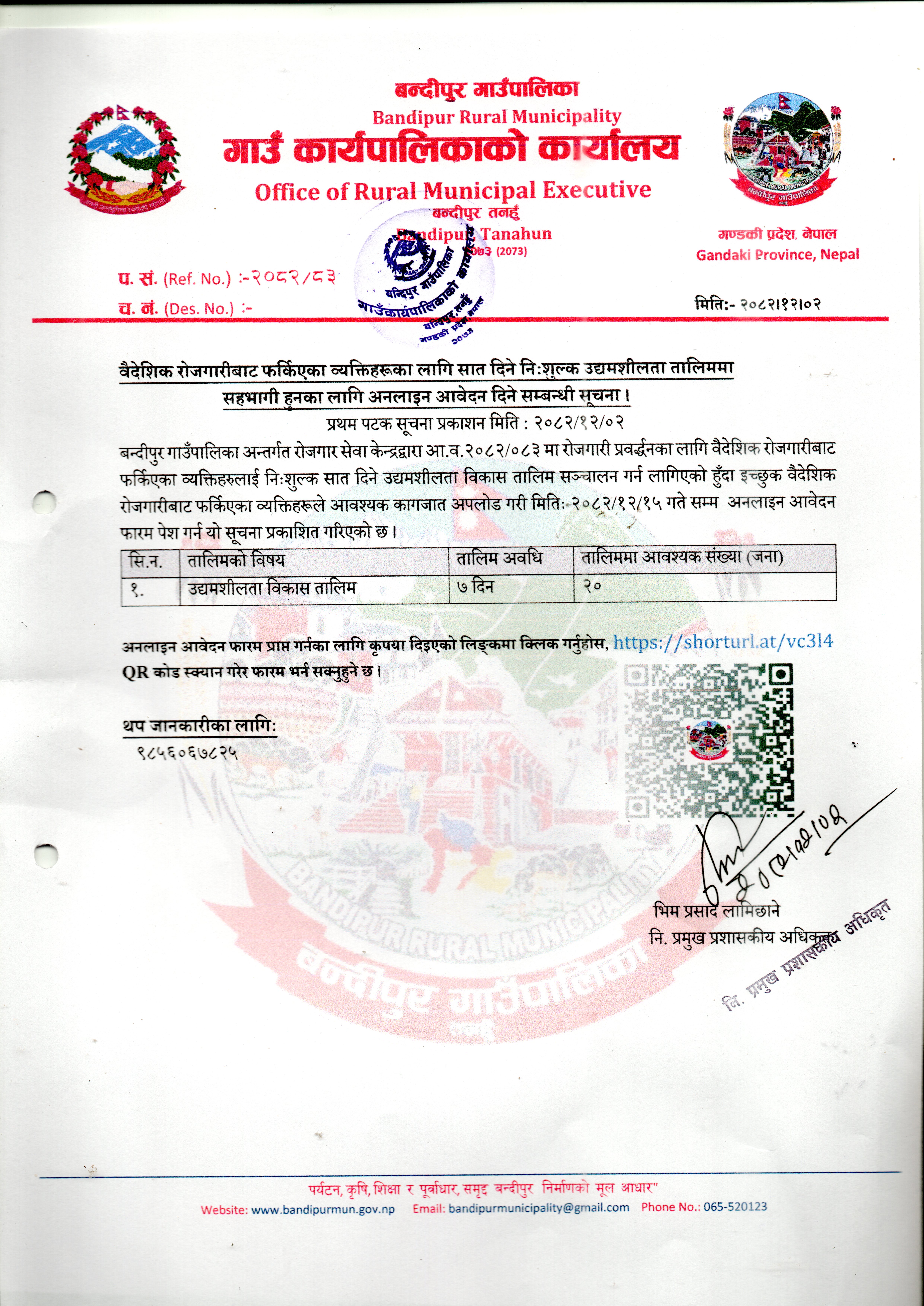 वैदेशिक रोजगारीबाट फर्किएका व्यक्तिहरूका लागि सात दिने निःशुल्क उद्यमशीलता तालिममा सहभागी हुनका लागि अनलाइन आवेदन दिने सम्बन्धी सूचना ।