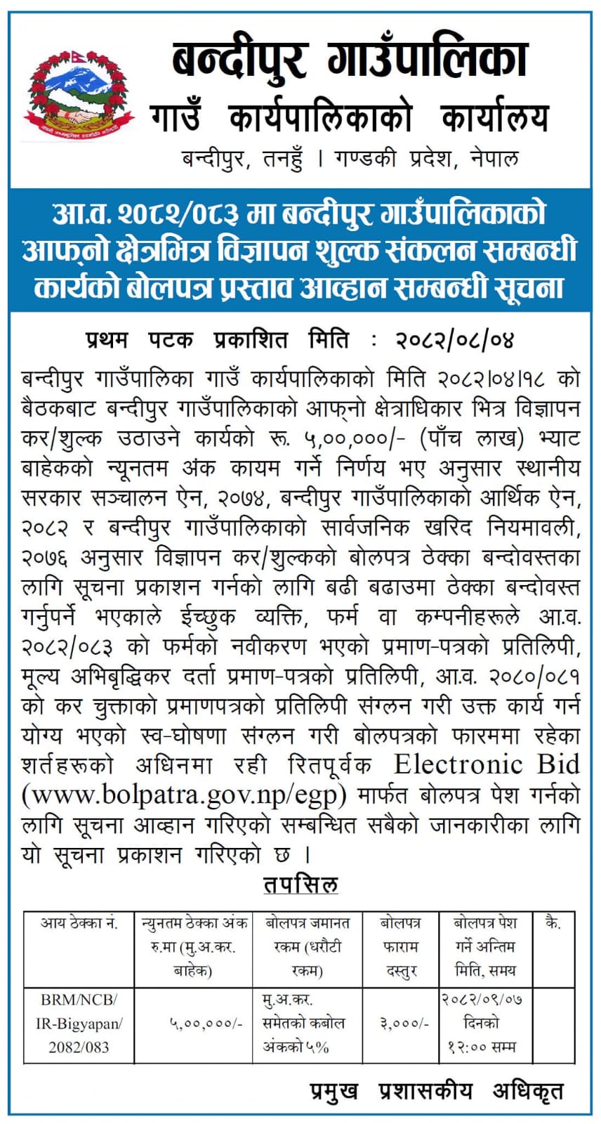 आ.व.२०८२/०८३ मा बन्दीपुर गाउँपालिकाको आफ्नो क्षेत्रभित्र विज्ञापन शुल्क संकलन सम्बन्धी कार्यको बोलपत्र प्रस्ताव आह्वान सम्बन्धी सूचना।