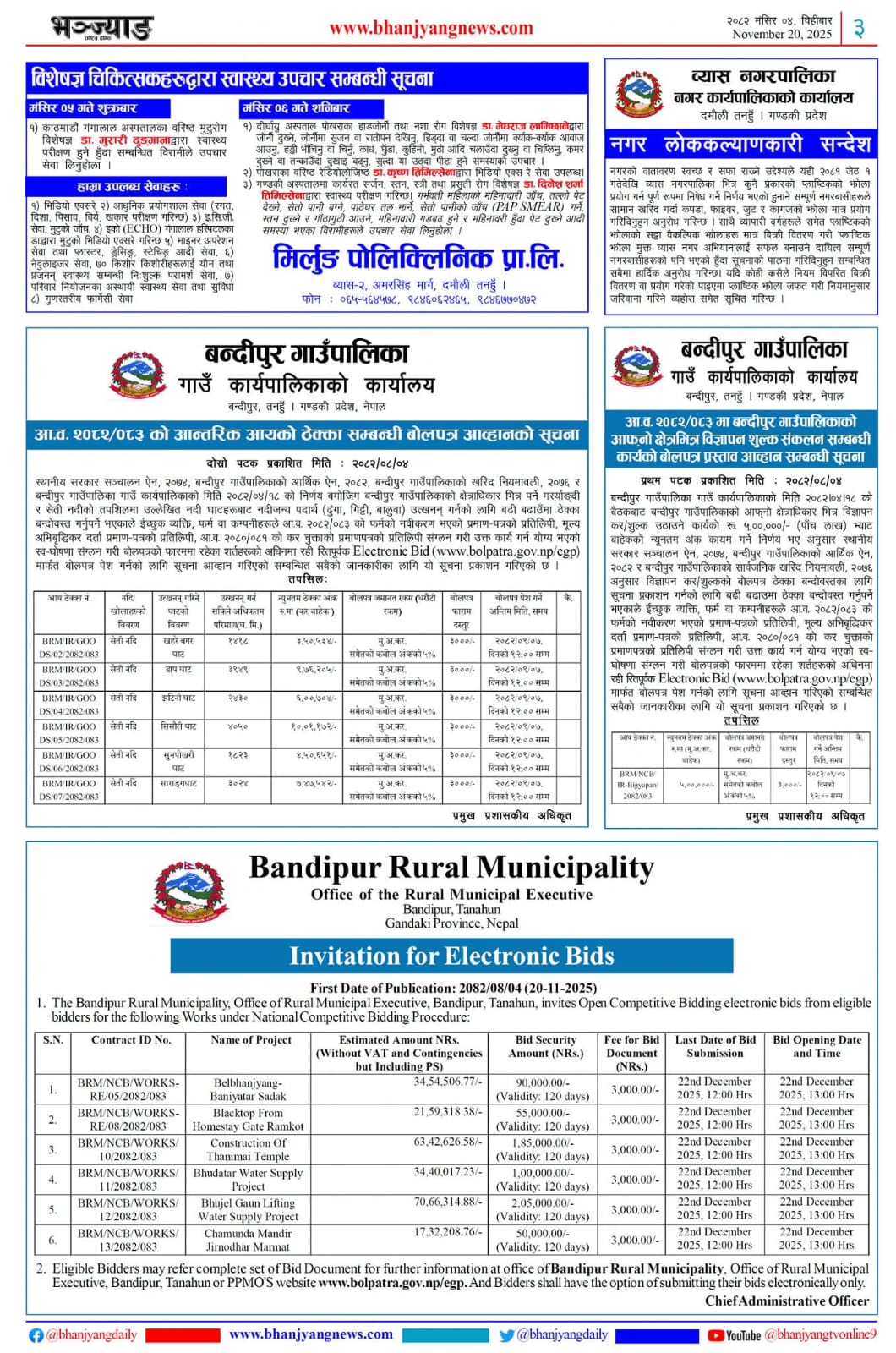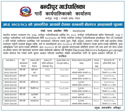 » आ.व. २०८२/०८३ को आन्तरिक आयको ठेक्का सम्बन्धी बोलपत्र आह्वानको सूचना।