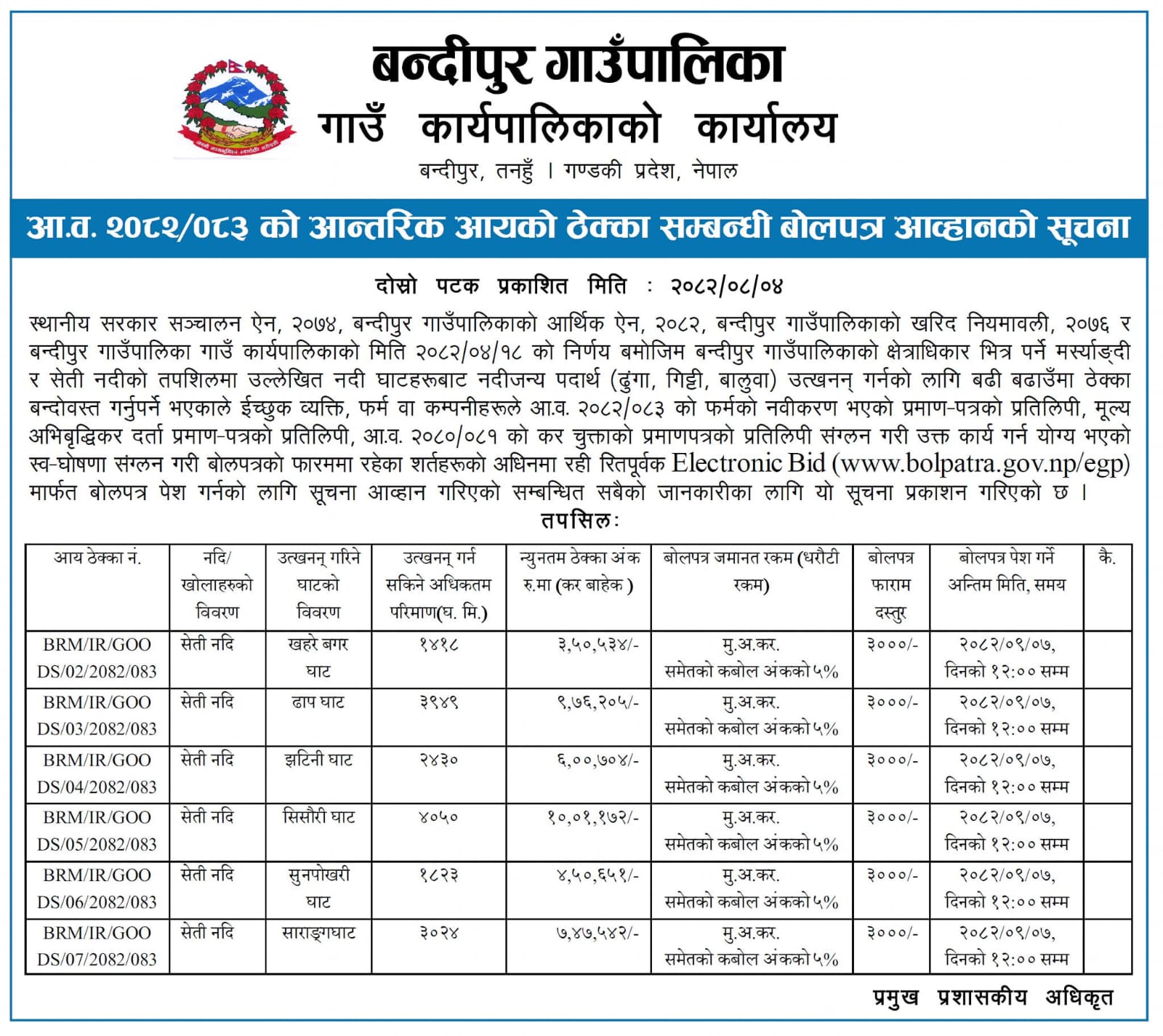 आ.व. २०८२/०८३ को आन्तरिक आयको ठेक्का सम्बन्धी बोलपत्र आह्वानको सूचना।