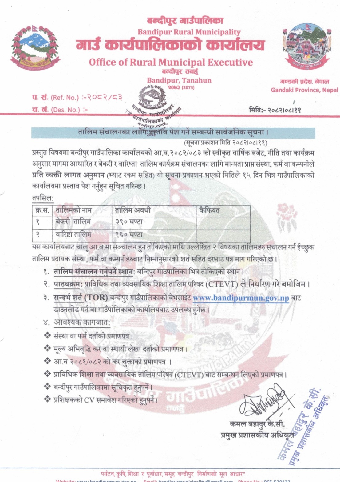 तालिम सञ्चालनका लागि प्रस्ताव पेश गर्ने सम्बन्धी सार्वजनिक सूचना।