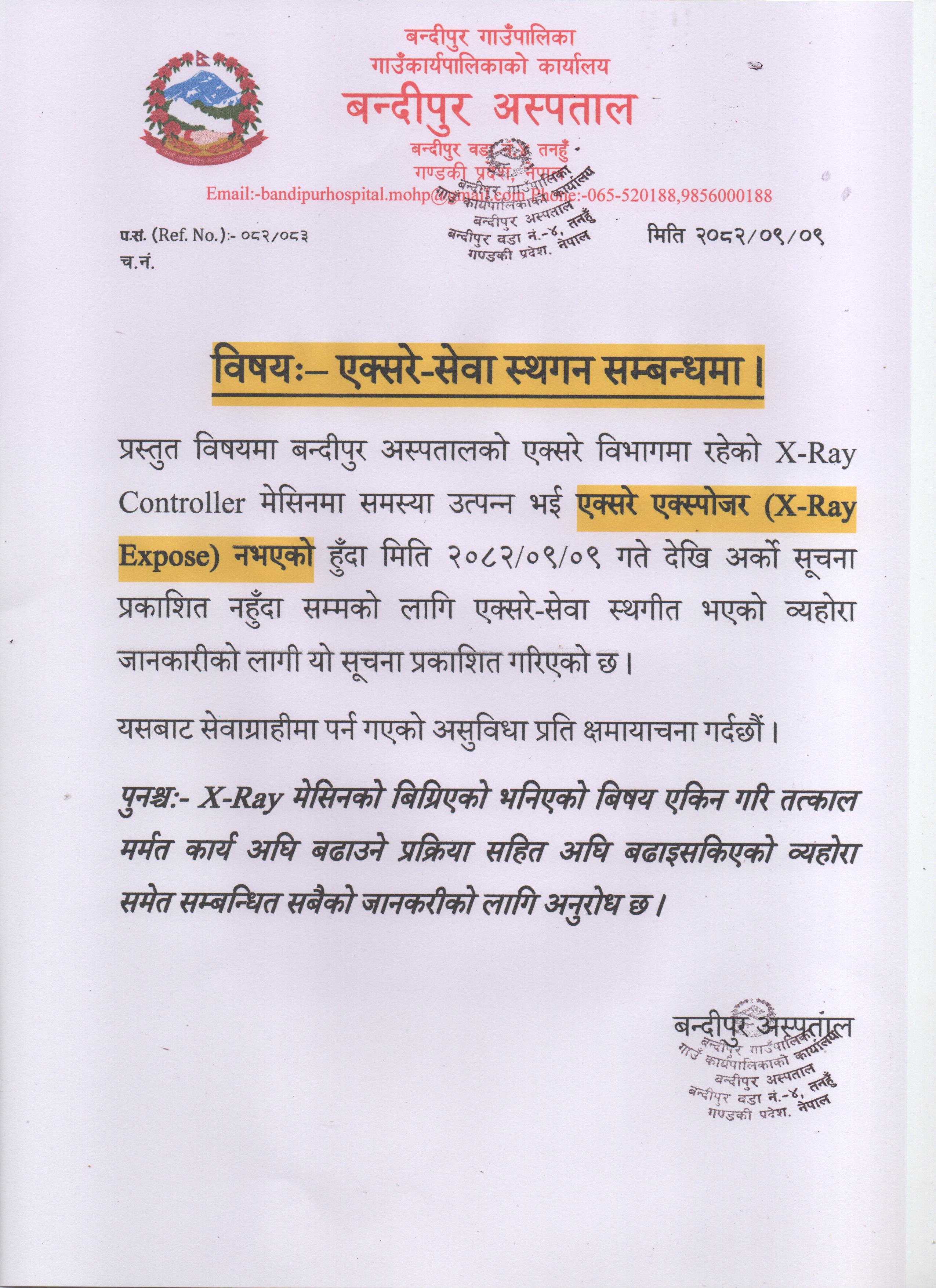 » बन्दीपुर अस्पतालको एक्सरे-सेवा स्थगन सम्बन्धमा।