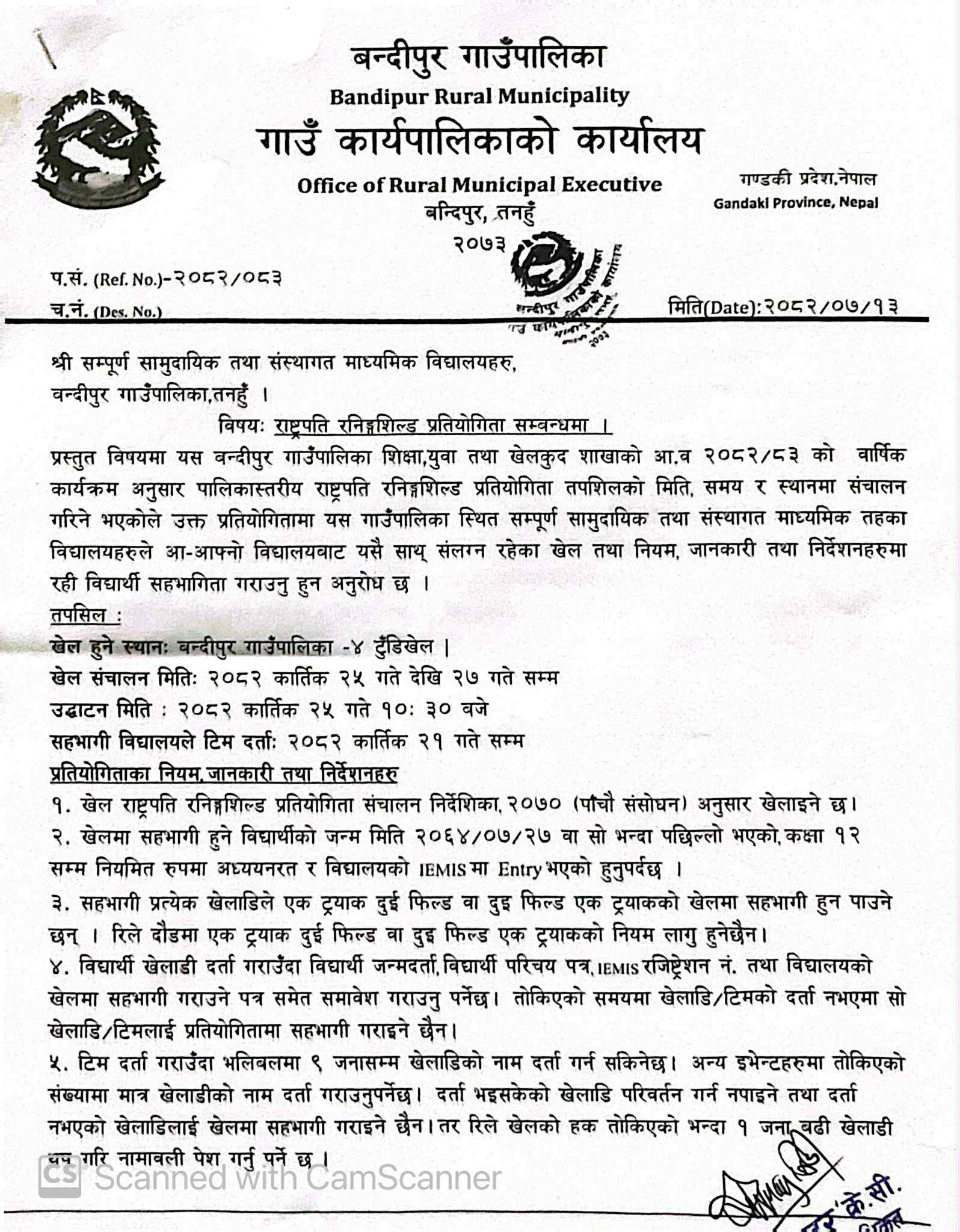 » राष्ट्रपति रनिङ्गशिल्ड प्रतियोगिता सम्बन्धी सूचना।