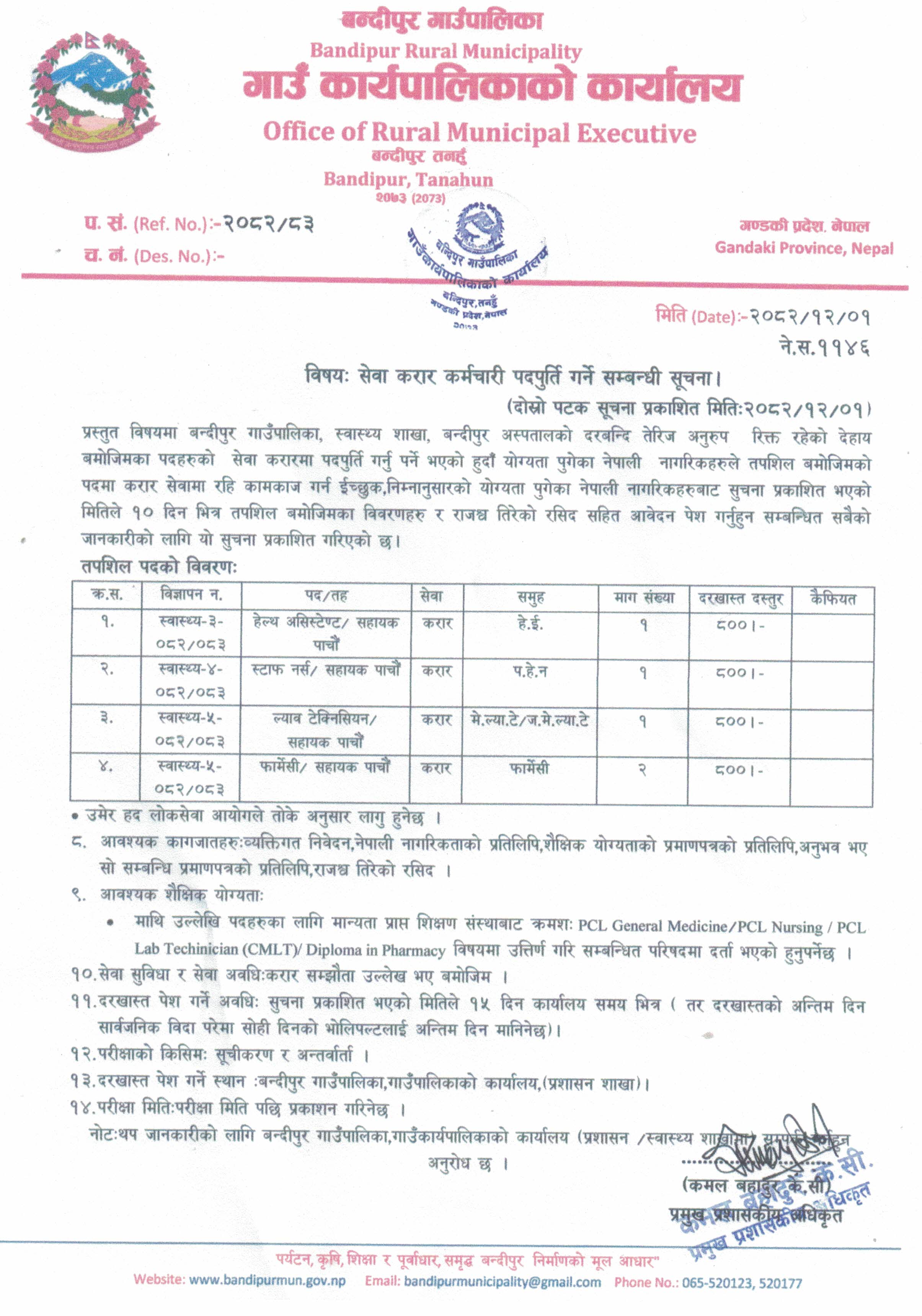 विषयः सेवा करार कर्मचारी पदपुर्ति गर्ने सम्बन्धी सूचना