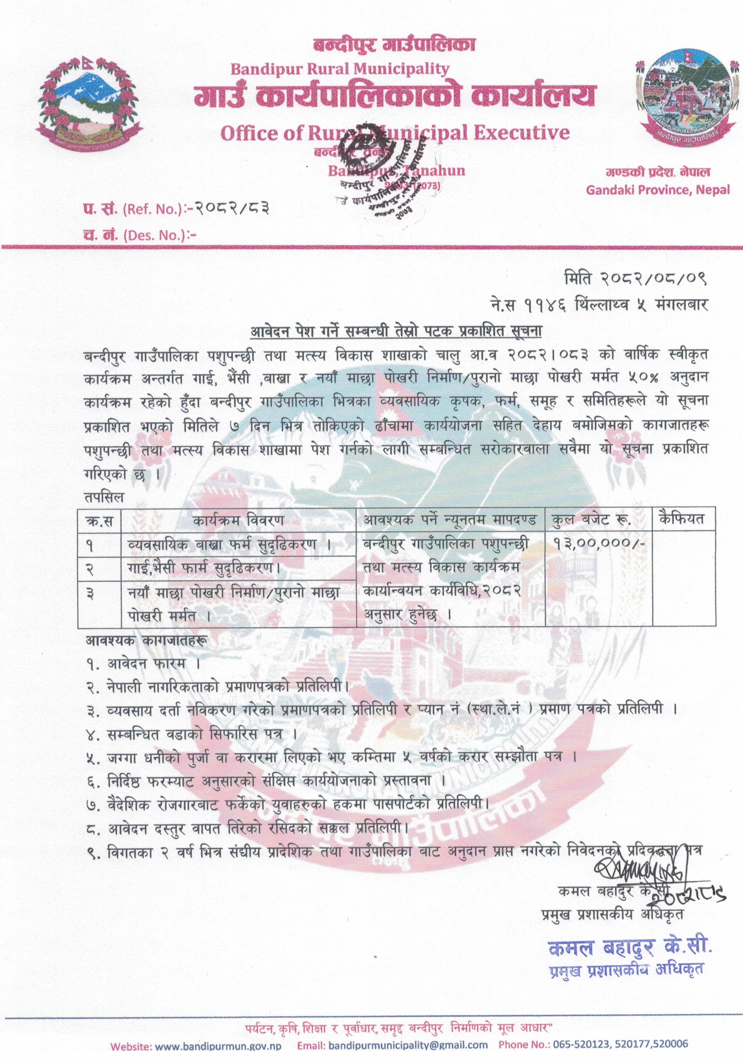 आ.व.२०८२/०८३ मा बन्दीपुर गाउँपालिकाको आफ्नो क्षेत्रभित्र विज्ञापन शुल्क संकलन सम्बन्धी कार्यको बोलपत्र प्रस्ताव आह्वान सम्बन्धी सूचना।