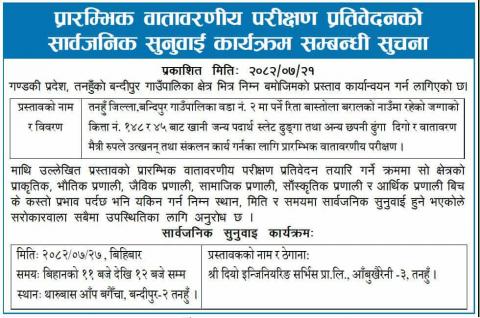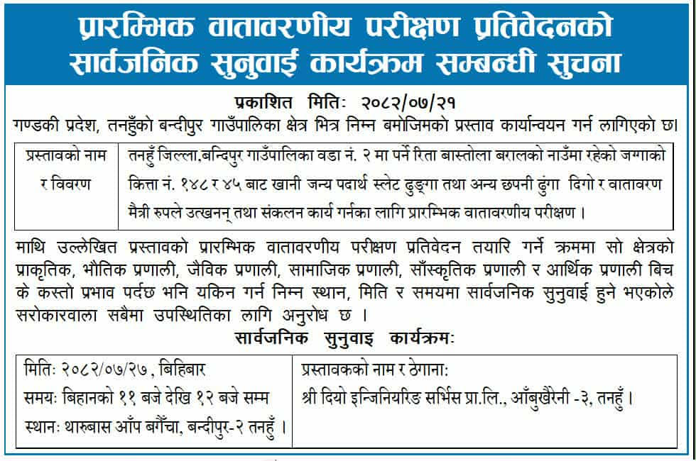 प्रारम्भिक वातावरण परीक्षण प्रतिवेदनको सार्वजनिक सुनुवाई कार्यक्रम सम्बन्धी सूचना।