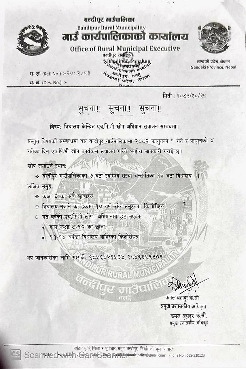 विद्यालय केन्द्रित HPV खोप अभियान सञ्चालन सम्बन्धी सूचना।