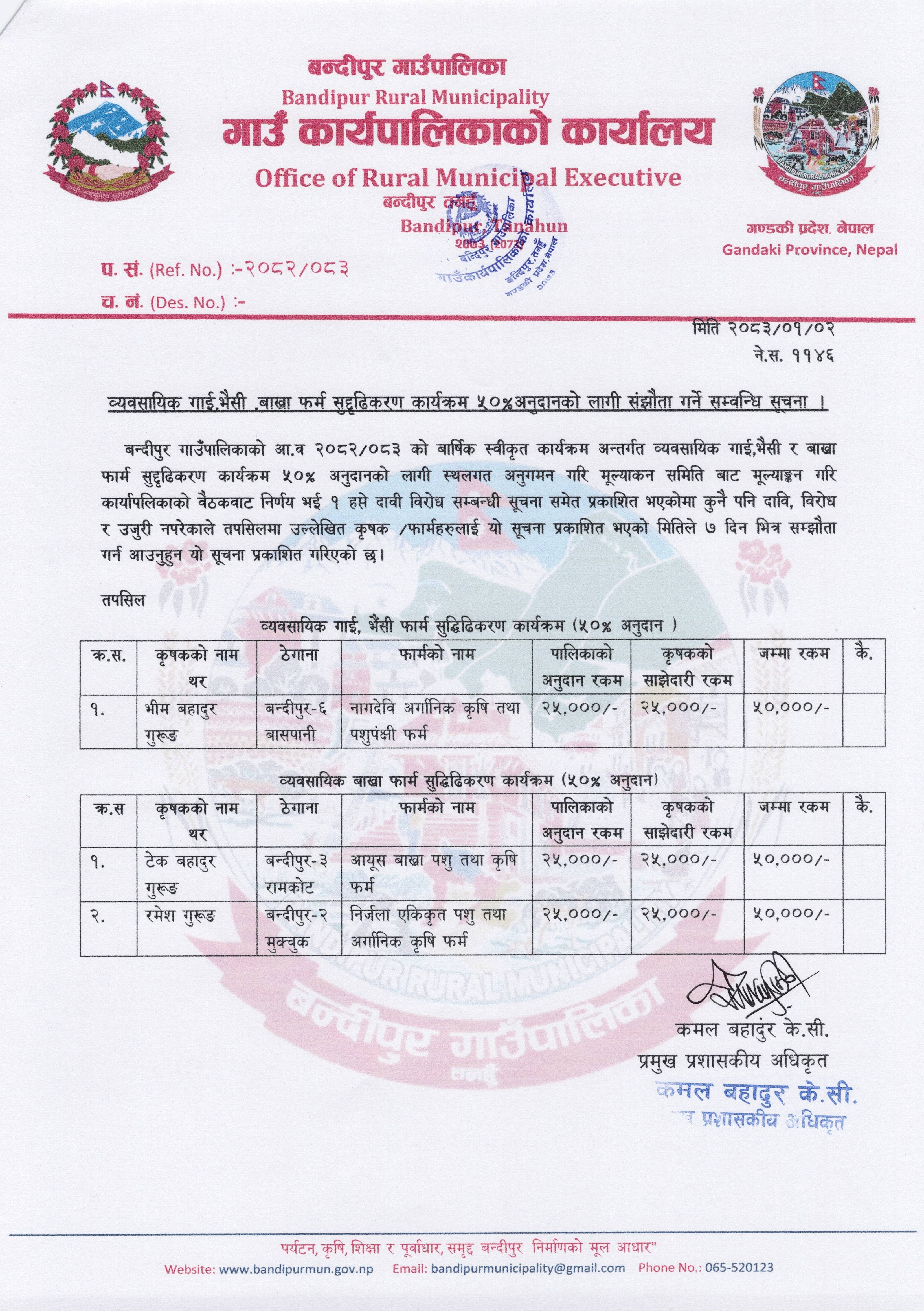 व्यवसायिक गाई, भैसी बाख्रा फर्म सुदृढिकरण कार्यक्रम ५०% अनुदानको लागी संझौता गर्ने सम्बन्धि सूचना ।