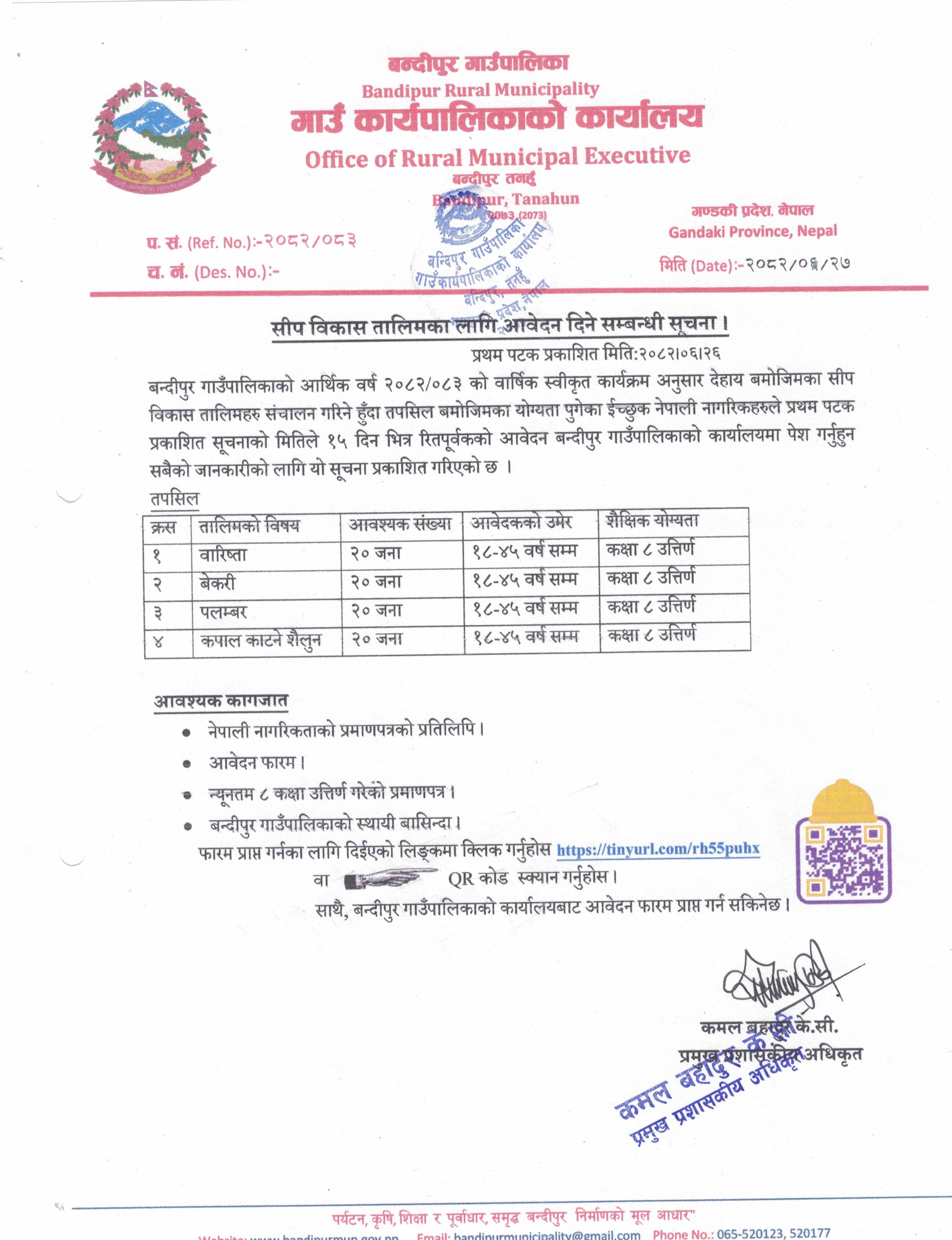 तालिमको लागि आवेदन सम्बन्धी सूचना।