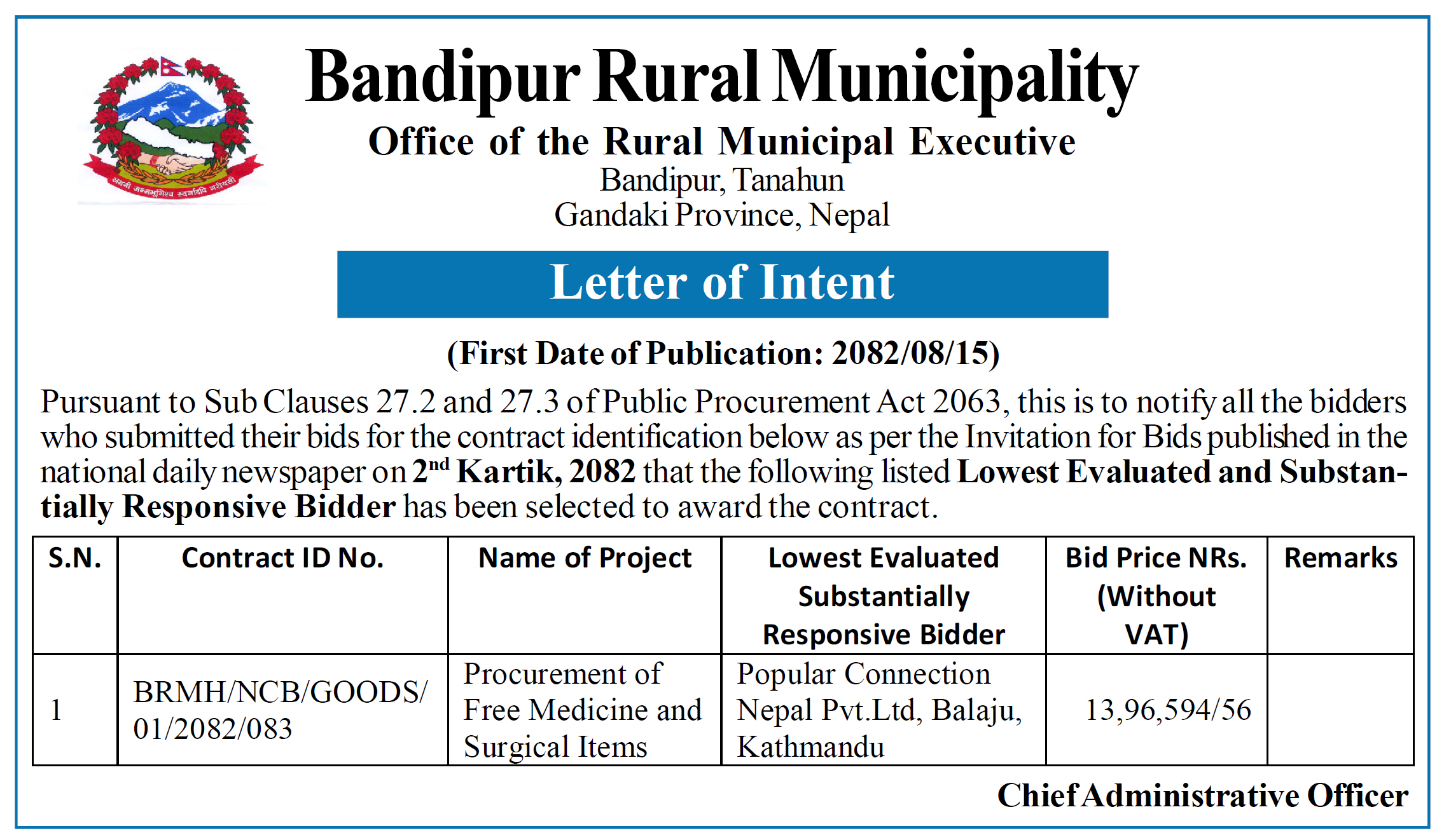 बोलपत्र स्वीकृत गर्ने आशयको सूचना।